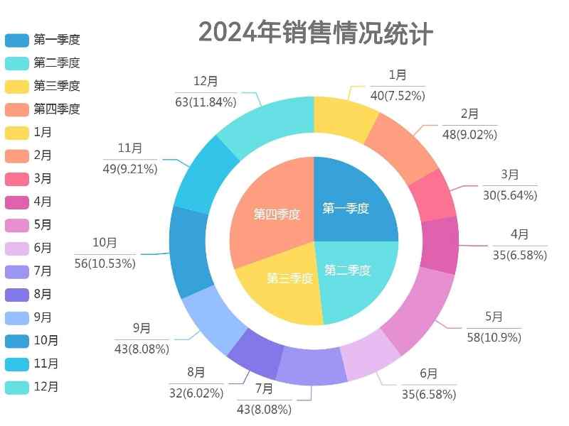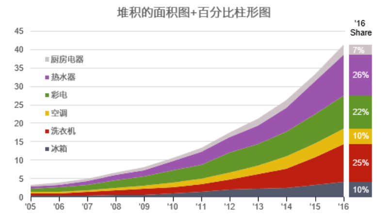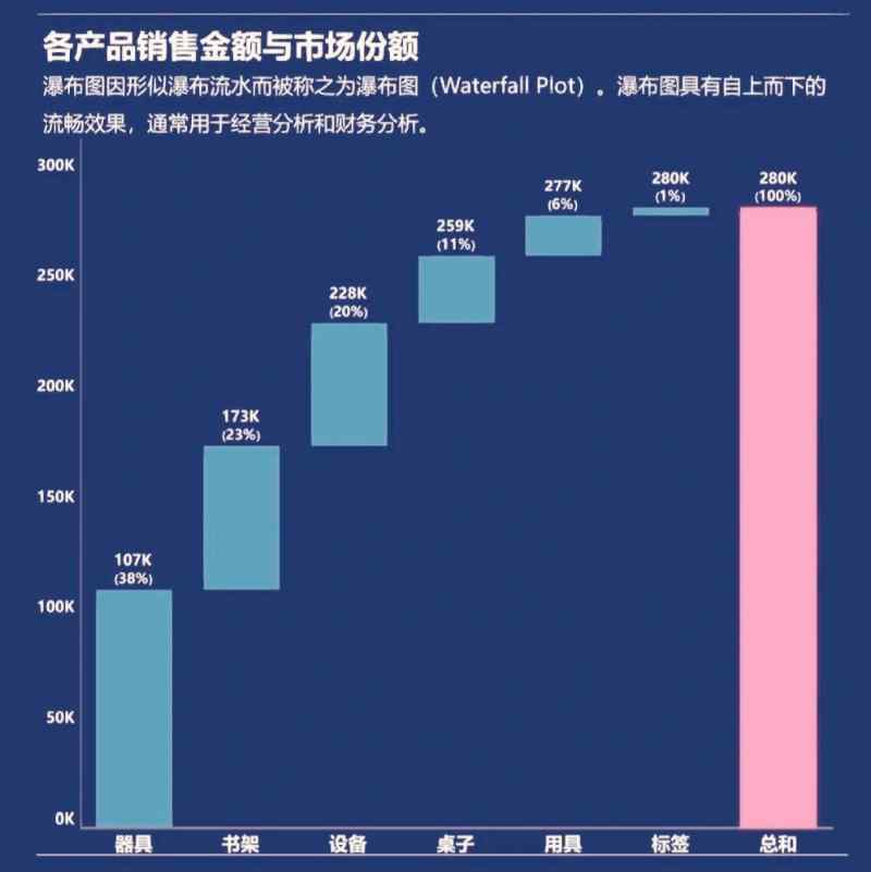 三、構(gòu)成類圖表:包括餅圖、環(huán)形圖、瀑布圖等。如下圖,餅圖與環(huán)形圖的組合。